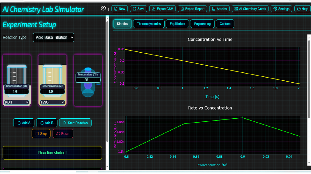 AI Chemistry Lab Simulator is a powerful, interactive virtual chemistry lab where you can mix chemicals, control reactions, and instantly visualize real-time results β powered by AI. Perfect for students, educators, or science enthusiasts. DEMO HERE: AI Chemistry Lab Simulator
